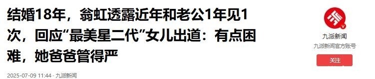 93. 九派新闻:《结婚18年,翁虹透露近年和老公1年见1次,回应“最美星二代”女儿出道:有点困难,她爸爸管得严》2025-07-09